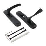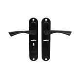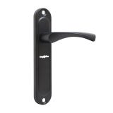 Комплект ручек, подпружиненный, на планке под сувальдный механизм замка. Предназначен для установки на деревянные и металлические двери толщиной 40 — 75 мм. Имеет полимерное покрытие.