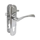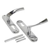 Комплект ручек, подпружиненный, на планке под цилиндровый механизм замка. Предназначен для установки на деревянные и металлические двери толщиной 35-45 мм. Имеет гальваническое покрытие.