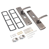 Комплект ручек, подпружиненный, на планке под цилиндровый механизм замка. Предназначен для установки на китайские металлические двери. Подходят для левых и правых замков автоматического и не автоматического закрывания.Имеет гальваническое покрытие.