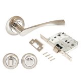 Комплект: ручка на круглой накладке, сантехническая завертка и защелка с фиксацией .Материал ручек и завертки — алюминиевый сплав, защелки - сталь. Многослойное гальваническое покрытие. Комплектуются винтовыми стяжками и шурупами. Длина разрезного квадрата - 95мм. Для деревянных дверей, толщиной 35-40 мм. Гарантийный срок эксплуатации — 3 года.