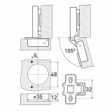 Петля 1109 - одноходовая мебельная с доводчиком и углом установки 90°. Она обеспечивает плавное и мягкое открывание/закрывание фасада одним движением, угол открытия составляет 105°. Врезная часть диаметром 35 мм., глубиной 12 мм.