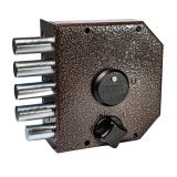 Замок накладной сувальдный с задвижкой. Предназначен для установки на металлические двери. Замок имеет засов из четырех цилиндрических ригелей диаметром 18 мм, с максимальным вылетом 40 мм, и задвижку диаметром 18 мм с вылетом 30 мм. Удаление ключевого отверстия - 64 мм. Количество полуоборотов ключа - 4. Габариты замка - 135х146х32,5 мм. При закрытом на задвижку замке использование ключей с наружной стороны невозможно. Защита от вскрытия замка отмычкой, защита от высверливания стойки ригеля и защита от вскрытия методом проворота.