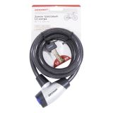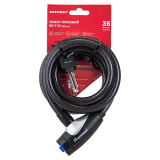 Замок навесной с тросом. Материал корпуса - сталь покрыта пластиком. Стальной трос в пластиковой оплетке (12мм - диаметр, 1500мм - длина). Цилиндровый механизм секрета, в комплекте 3 перфоключа. Защитная шторка на скважине препятствует попаданию в механизм грязи и влаги. Предназначен для запирания дверей, ворот, а также для предотвращения хищения велосипедов, детских колясок, санок, лодочных моторов и др. предметов.