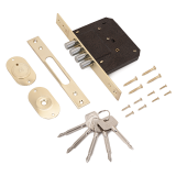 Комплектация: корпус замка, 5 крестообразных ключей, ответная планка, накладки на механизм секрета, комплект крепежа.