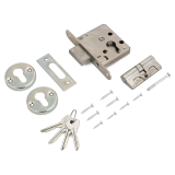 Комплектуется цилиндровым механизмом 70мм с 4 ключами, запорной планкой, комплектом накладок и комплектом для крепежа.