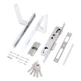 Прямоугольный ригель, вылет 10,5 мм. Универсальная защелка. Корпус и торцевая планка из нержавеющей стали. Межосевое расстояние 85 мм. Удаление ключевого отверстия 20мм. Полимерное покрытие ручек по каталогу RAL, материал сталь. Механизм секрета с перфоключом, длина 70 мм, ключ/ключ. 5 ключей. Материал - цинковый сплав.